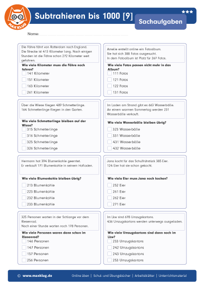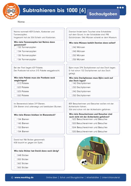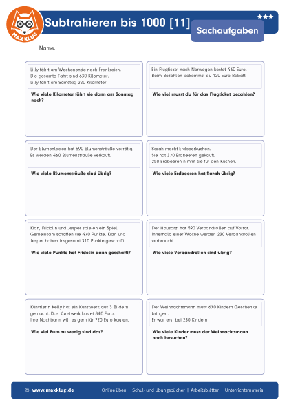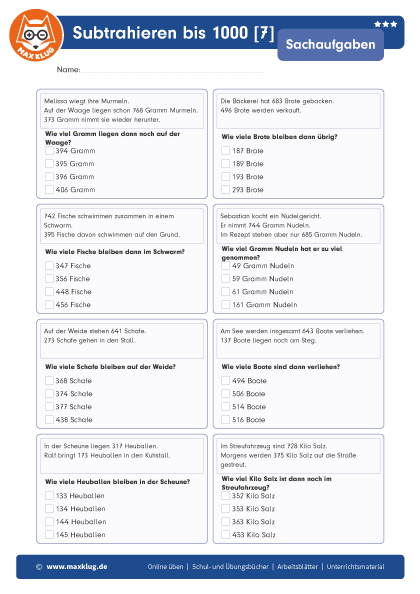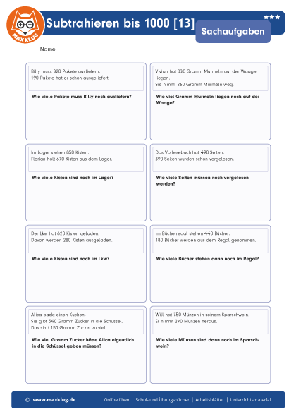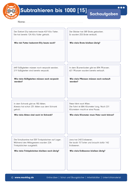 Arbeitsblätter > Sachaufgaben > Subtrahieren > bis 1 000
